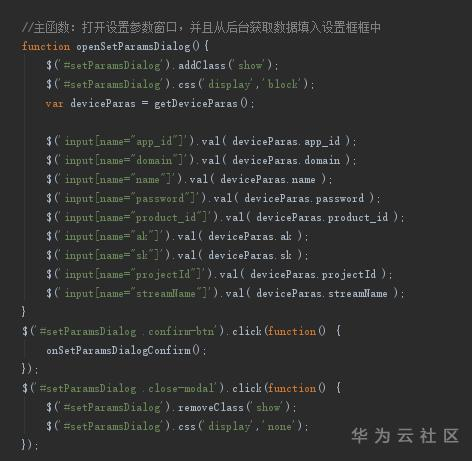 首次访问智慧路灯应用以及点击“参数设置”按钮时,会弹出参数设置窗口,这个窗口的行为由openSetParamsDialog()函数控制。