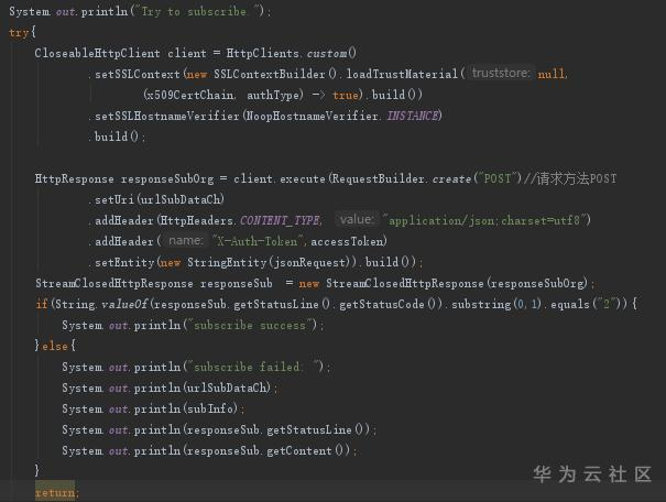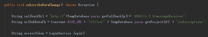 这个方法是个调用接口的方法,首先通过调用LoginService类的login()方法获取accessToken,然后再调用设备接入的的创建订阅接口。创建订阅接口用于应用向平台订阅设备数据,是物联网应用向物联网平台获取数据的一种方法,本文不进行详述,感兴趣的同学可以查看我们之前的博文。