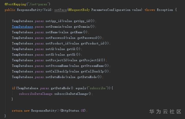 通过文件搜索,我们可以找到/set-paras接口对应的后端函数是SetCustomData类的setPara(@RequestBody ParameterConfiguration value)函数,其作用是将参数值写入TempDatabase类中的paras实体,并在用户设置的数据获取方式为订阅推送时调用subscribeDataChange()函数。
