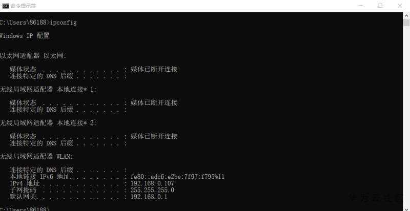 再用ipconfig查询一下本机IP,如下图。