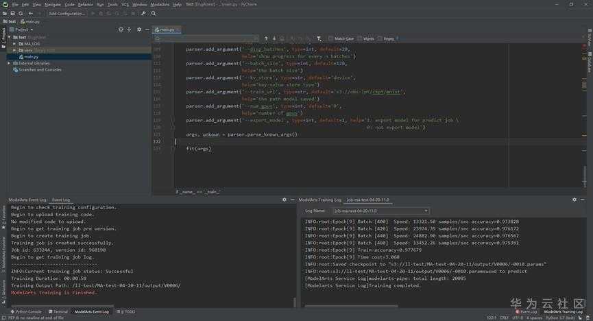 这样我们就完成了pyCharm IDE与ModelArts的对接工作,进入下一步,实际训练一个模型。