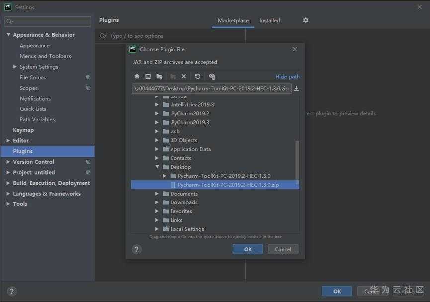 下载一个工具Pycharm-ToolKit-PC-2019.2-HEC-1.3.0.zip,连接本地IDE与云之间的链路:
