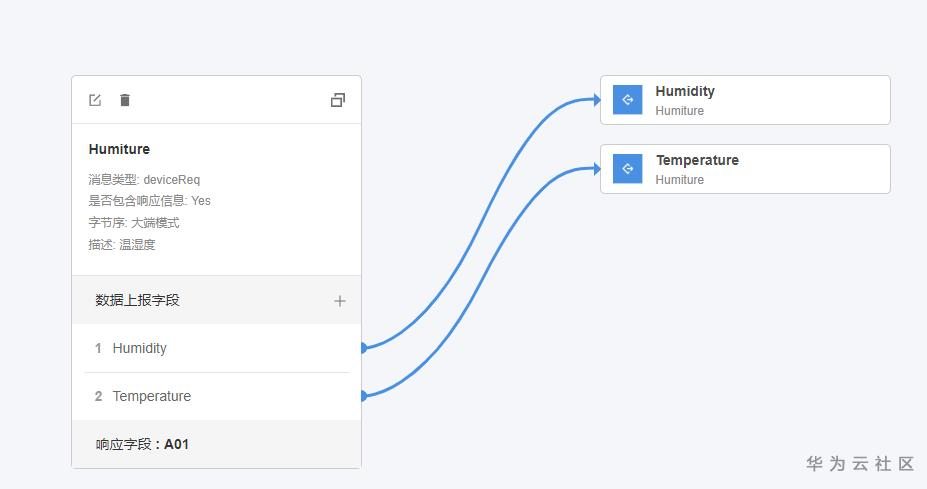 可以看到,我的消息与右侧的模块已经建立了逻辑关系,温度和湿度已经通过箭头发送到平台,而且还有一个响应字段,意思就是说平台收到我的信息之后就会回复给我的板子或模组一个A01的信息,我的板子或模组收到后就知道了“哦,他已经收到我发的了”。
