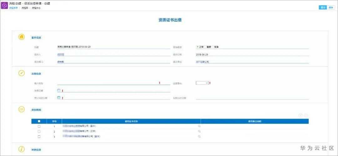 通过资质出借流程,或者通过证照信息建模查询列表快捷发起出借申请。在申请过程中,流程自动记录使用信息,申请人/出借人是谁、借阅了什么、打算什么时候归还等等,一一备案,随时追踪。