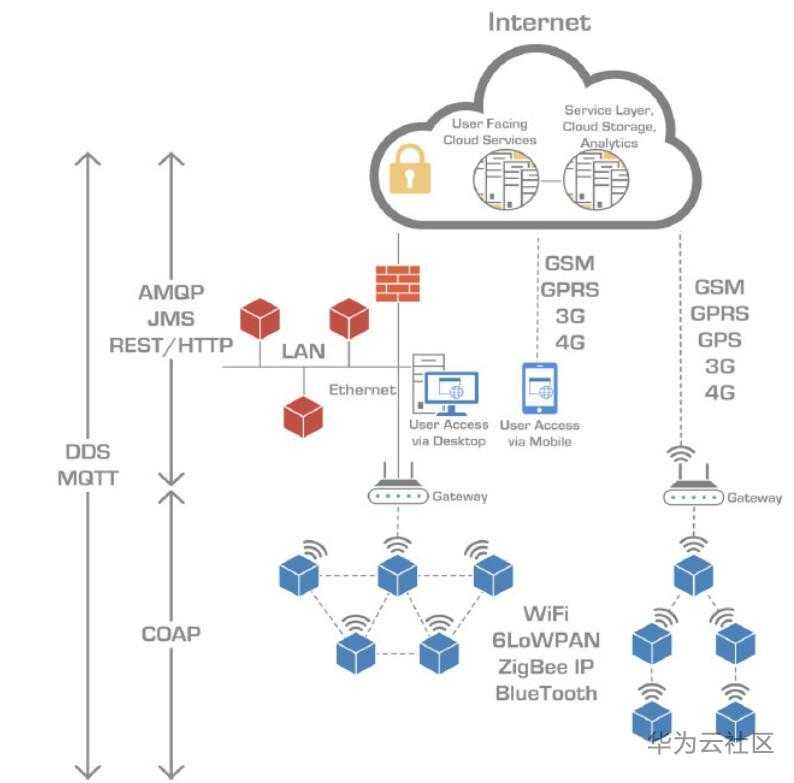 物联网的通信环境有Ethernet, Wi-Fi, RFID, NFC(近距离无线通信), Zigbee, 6LoWPAN(IPV6低速无线版本),Bluetooth, GSM, GPRS, GPS, 3G, 4G等网络,而每一种通信应用协议都有一定适用范围。AMQP、JMS、REST/HTTP都是工作在以太网,COAP协议是专门为资源受限设备开发的协议,而DDS和MQTT的兼容强。