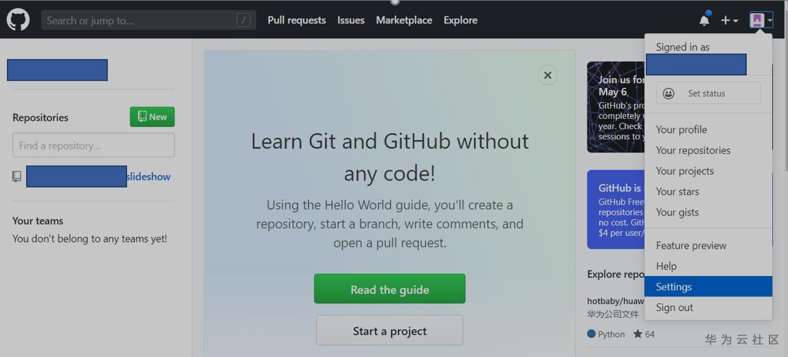 点击右上角的个人Profile右侧的向下的小箭头,在出现的下拉列表框中,点击Settings