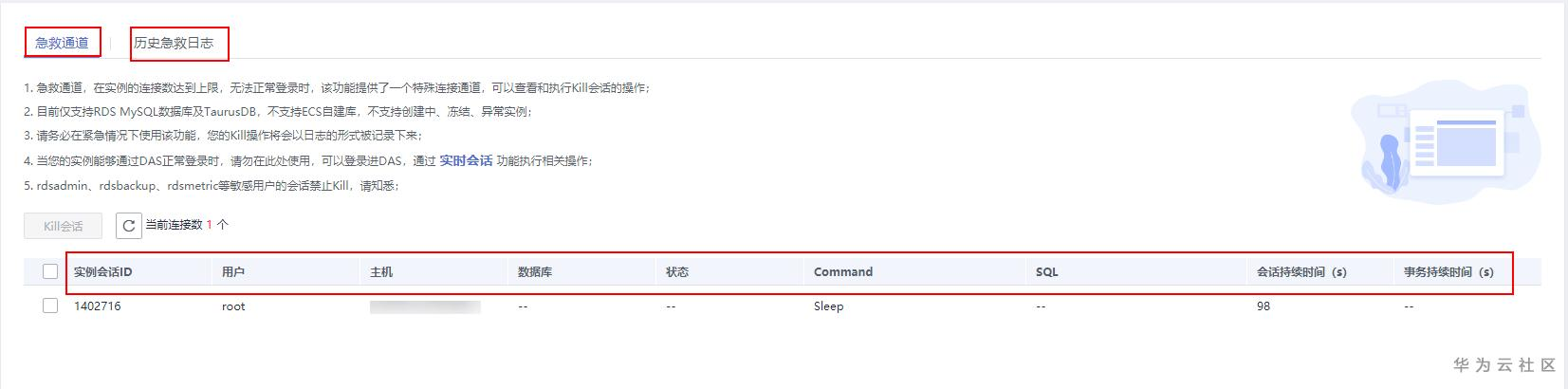 Ø 紧急Kill会话:当数据库实例的连接数达到上限,无法正常登录时,该功能将会提供一个特殊连接通道,帮助用户查看和执行Kill会话的操作。