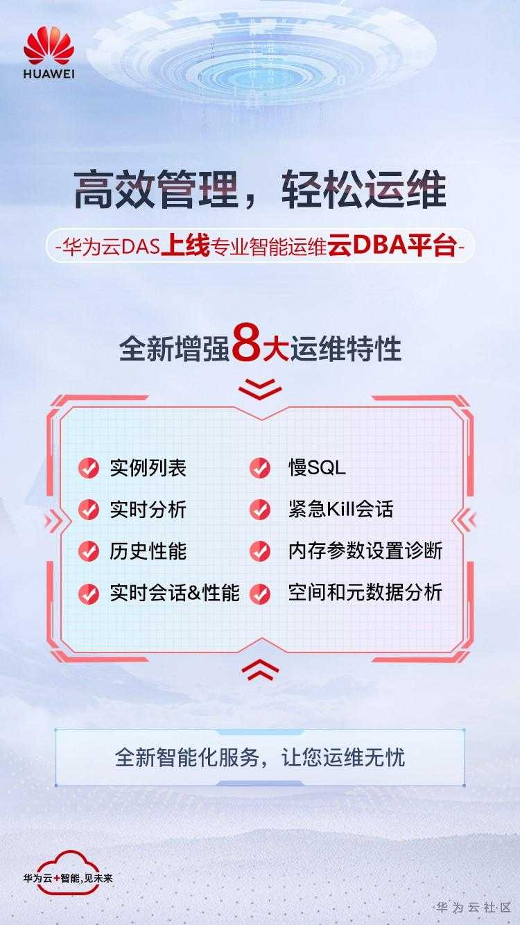 华为云数据管理服务DAS跟紧时代的步伐,针对运维急需解决的痛点,推出了云DBA运维平台,提供了 8大运维功能,为用户提供更加智能化、自助化、专业化运维服务。