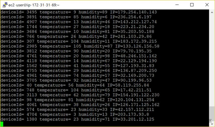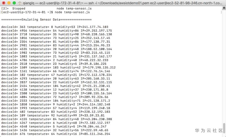 # 执行Emulator Node.js 应用程序 $ cd /home/ec2-user $ node temp-sensor.js # 执行后的输出类似于: