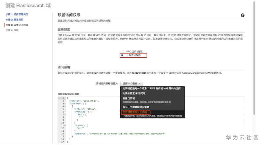 3.设置访问权限,网络配置要设置为 公有访问权限。因为Elasticsearch 规则操作不支持 VPC Elasticsearch 集群。如下图: