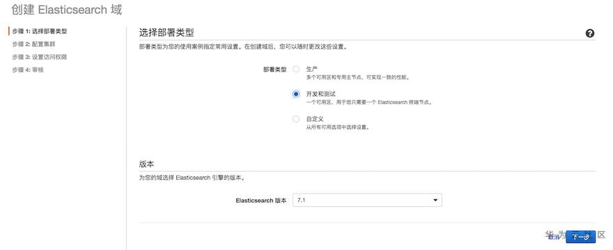 1.在控制台搜索elasticsearch Service并创建配置集群。由于是测试,就选择开发和测试环境就好。