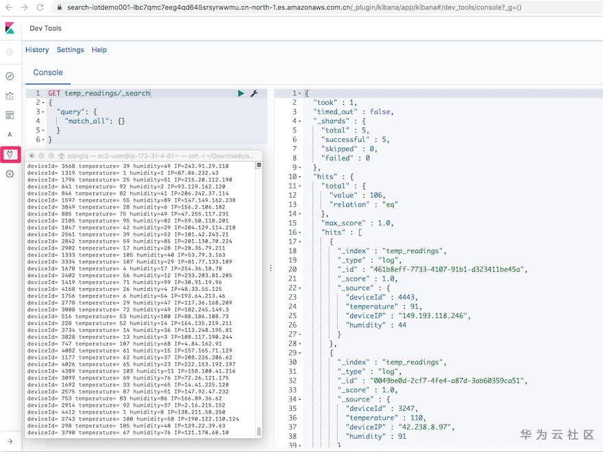 当Sensor发出消息,通过规则引擎(rule engine)过滤数据并触发 Simple Notification Service以邮件的方式提醒用户温度和湿度异常。同时通过另外一条规则引擎存储过滤后的数据并通过Kibana进行展现。