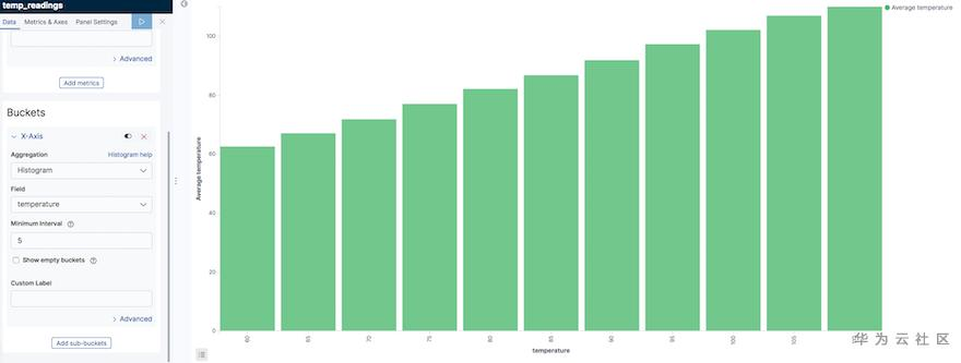 11.在visualize中设计报表,消息的维度一共是四个,分别为deviceId、temperature、deviceIP、humidity。根据个人喜好定义维度所在的X和Y轴即可。