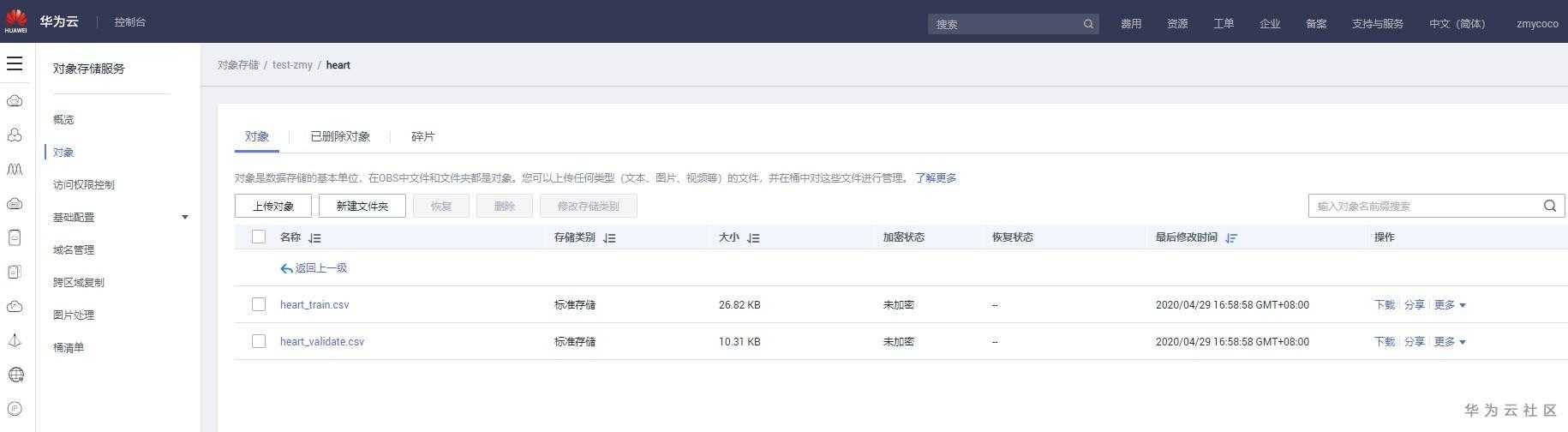 下载数据之后,我们接下来做的是上传数据到华为云。华为云提供了OBS桶用于存放文件,本文所涉及的csv文件可以作为对象上传。上传文件截图如下图所示:
