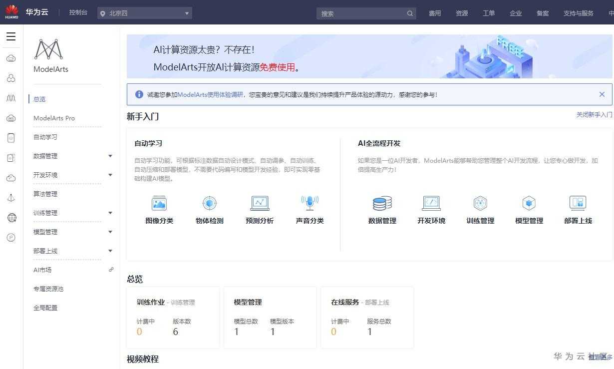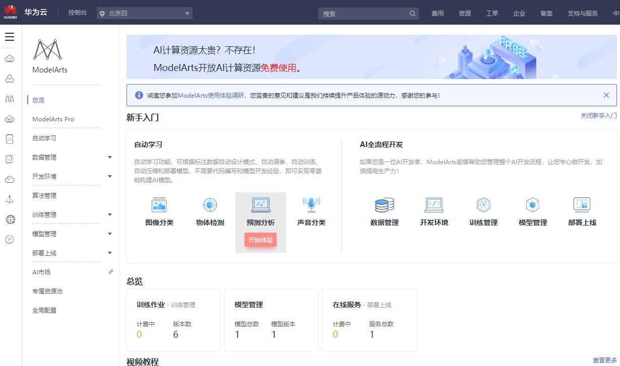 接下来就可以进行模型训练了。首先登陆网站https://console.huaweicloud.cn/modelarts/,首页如下图所示: