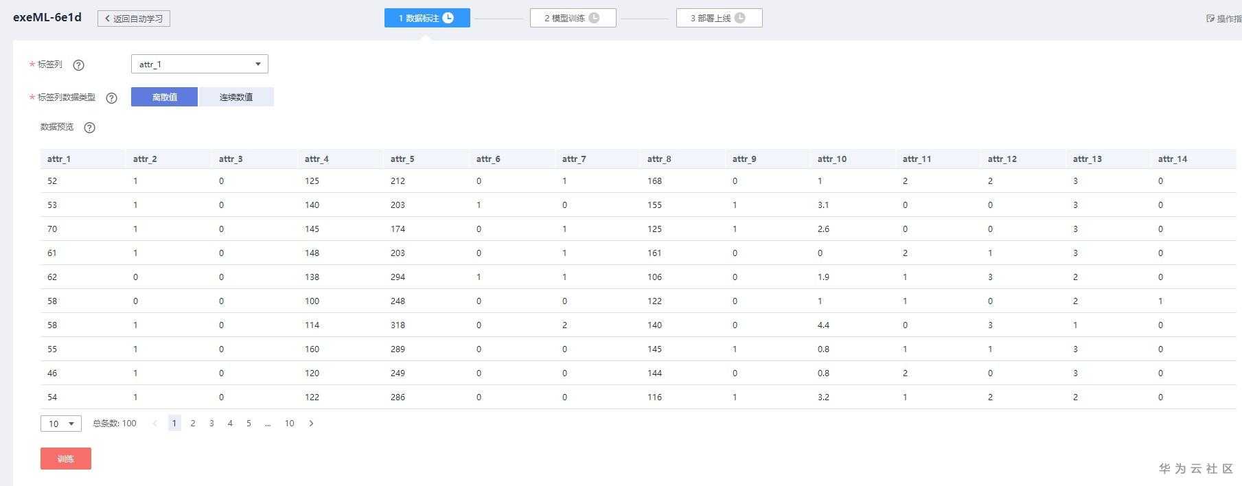 注意,上传文件前请删除表头字段名,否则训练过程中会报错。此外,数据集不用自己划分为训练集和测试集,AI平台会自动按照7:3的比例进行切分。数据预览如下图所示: