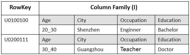 如果将拥有标签数据的对象称之为一个实体,实体可理解成人、车辆、手机号码、图片等等,每一个实体所拥有的标签数量是不固定的,这天然与HBase数据表的"稀疏矩阵"特点吻合,再结合HBase自身的高性能随机读写能力、强数据一致性、优秀的线性扩展能力等特点,促成了很多标签应用选型HBase作为数据存储系统。