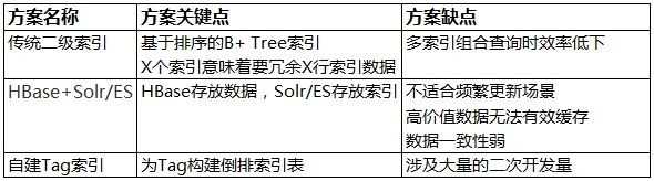 使用HBase来存储标签数据,而标签索引则基于Solr/Elasticsearch这样的"外挂"索引方案来实现,这是一种比较常见的组合应用方案,或者,直接将所有数据都存储在Solr/Elasticsearch中。