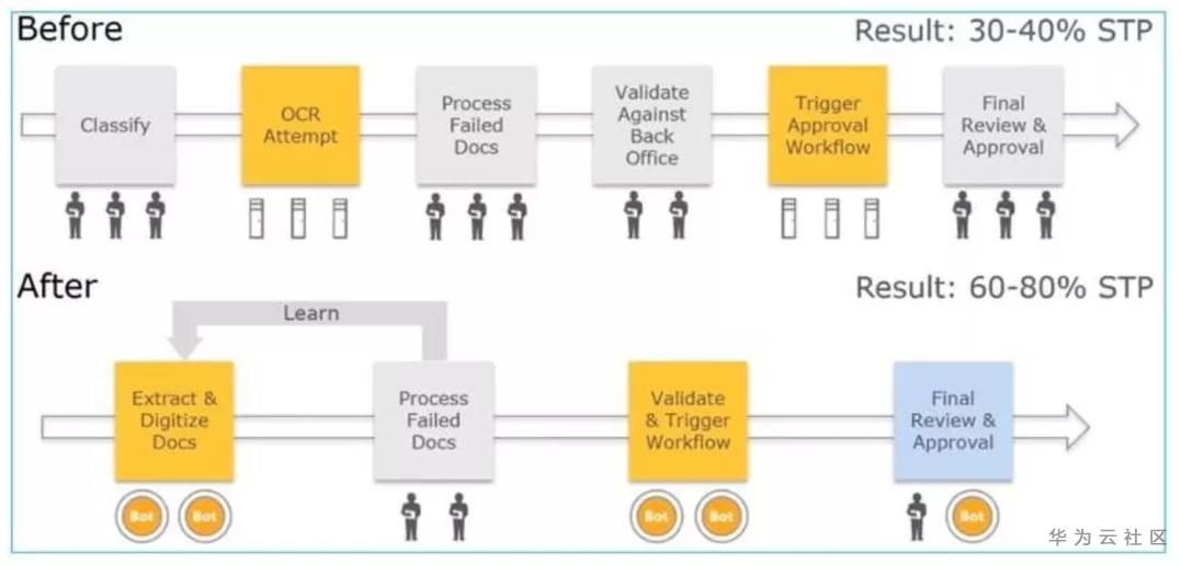 通过统计方法和机器学习。NLP将文本转换为数据,反之亦然,允许人与人之间有意义的互动。它包括自然语言理解和生成,例如:保险公司处理索赔、银行抵押贷款,这些都需要补充材料,包括图片(身份证信息)、表格信息、邮件信息、文本信息等等,这些都是非结构化信息,很难直接使用RPA自动化,影响了这个流程的效率。文本,电子邮件,信件和图像,首先通过NLP和图像识别技术以便进一步处理。