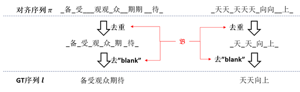 操作过程。假设我们有对齐序列“_备_受___观观_众__期期 __待_”(其中下划线表示blank),在去重之后,我们就可以得到“_备_受_观_众_期 _待_”,注意到下划线(也即blank)也是需要去重的。最后,我们再去除下划线就可以得到最后的结果——“备受观众期待”。