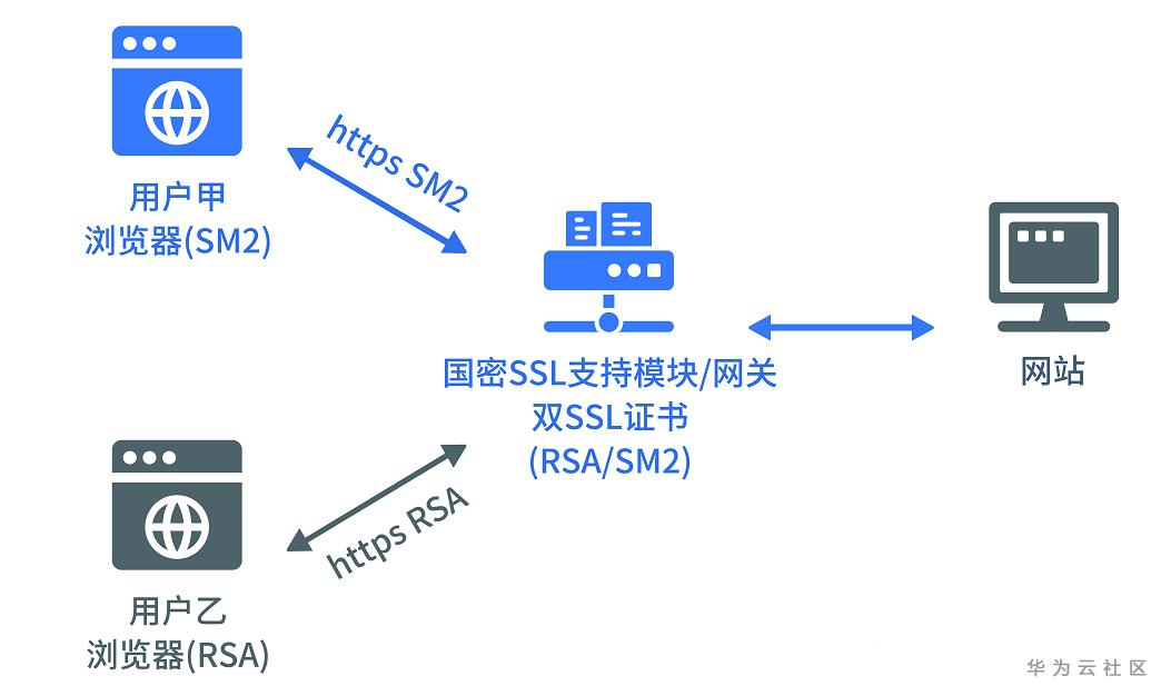 SM2算法体系是我国自主研发的一系列国产商用密码算法,安全性能优于RSA算法,具备替代RSA算法的性能条件。但由于浏览器、操作系统等常用软件环境不支持SM2算法体系,使用国密算法HTTPS加密的网站系统无法兼容常用浏览器,如果要求用户仅用指定浏览器访问网站系统,就大大降低了网站系统的可用性和使用体验。