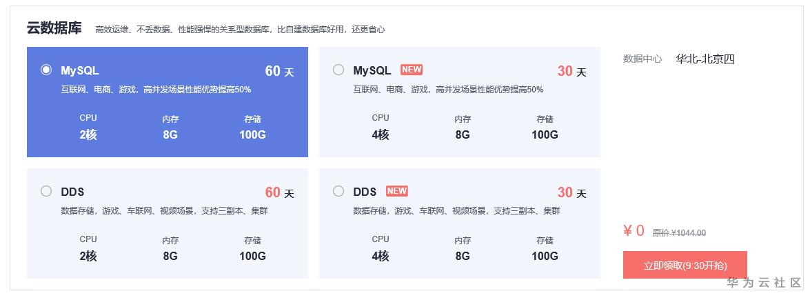 疫情期间,华为云新用户可免费试用MySQL和DDS 2个月,每天限额30份,数量有限,先到先得。
