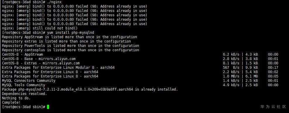 执行以下命令,安装MySQL数据库服务器、MySQL客户端和MySQL开发所需的库及包含文件。