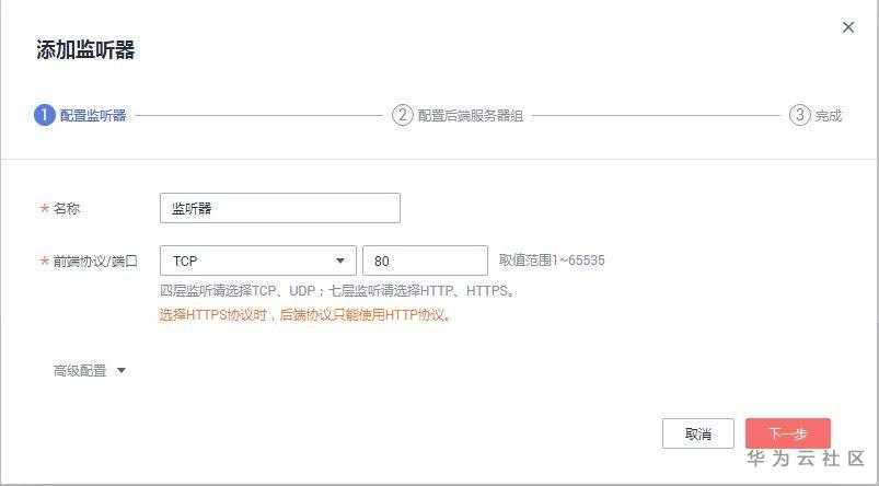 四层监听请选择TCP/UDP,七层监听请选择HTTP/HTTPS。