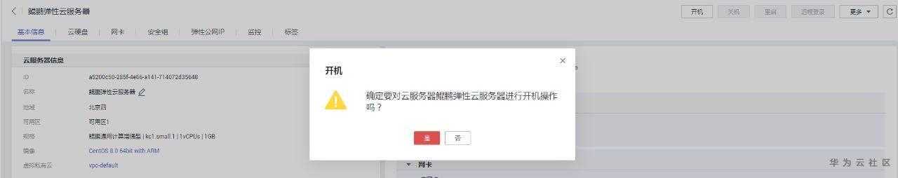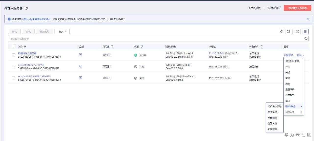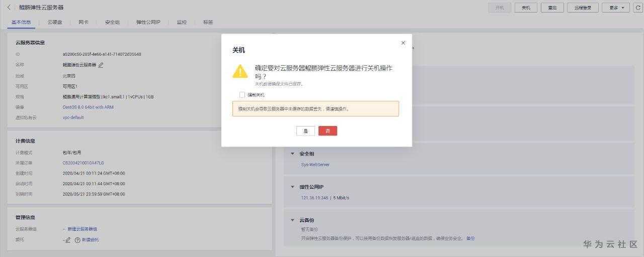选择“计算 > 弹性云服务器”,关闭运行中的弹性云服务器。