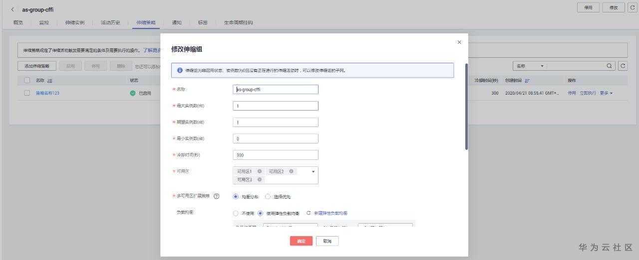 选择可用区、伸缩配置策略、最大实例数、期望实例数等配置