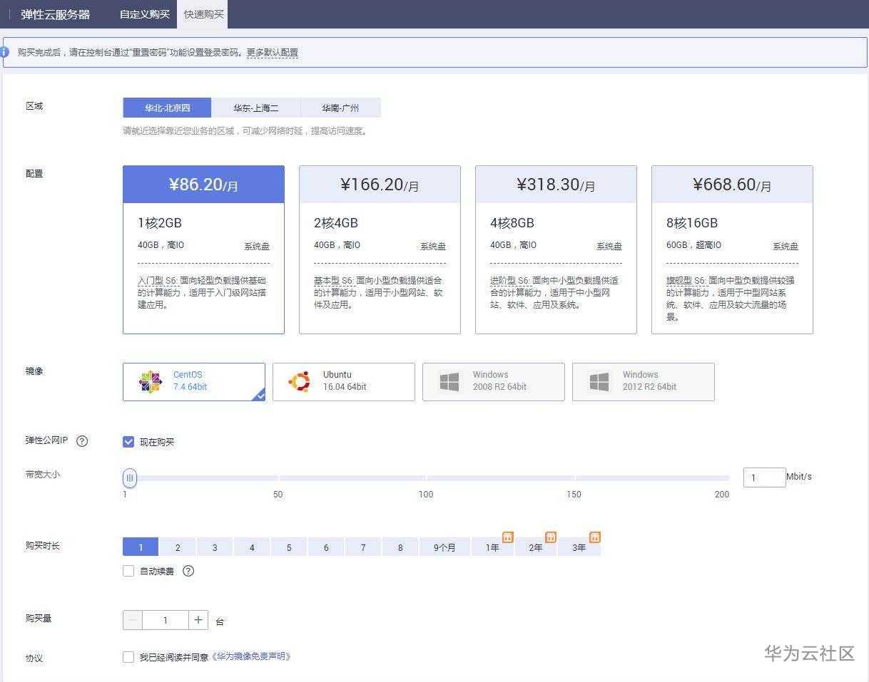 首先,登陆华为云官网购买服务器,普通的预装CentOS系统即可,具体配置一般用1核2GB带宽1Mbps的QPS可达1~3万,足够日常使用。