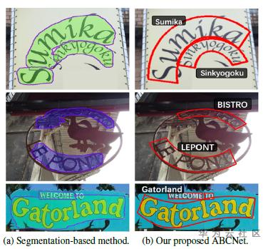 一个常见文本框可以由水平框、倾斜框等表示,而对于曲形的等不规则文本倾斜框等无法完美表征,现有一些基于分割的方法可以通过预测文本框的分隔结果然后通过后处理得到多边形框来尽量贴合曲形文本,而本文提出通过连续平滑的贝塞尔曲线来对曲形文本进行更加贴合的覆盖。