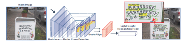 该算法骨干网络为常用的ResNet50加FPN来融合多尺度特征,检测分支为在多个尺度上的特征图上进行类似于EAST的anchor free的密集预测文本的外接矩形框,然后通过RoIAlign对于文本框特征进行提取然后预测回归其对应的贝塞尔曲线控制点(这里论文讲的不是非常清楚,感兴趣可以等代码开源),之后由该文提出的BezierAlign对预测的文本框即相应的贝塞尔曲线系数在特征图上进行矫正然后输入到后接的基于CTC的识别网络,实现端到端的检测、识别。