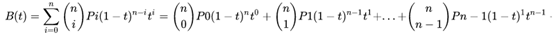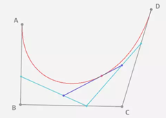 (1)为贝塞尔曲线公式,P0~Pn为相应的控制点,略去数学证明,一个三阶的贝塞尔曲线绘制过程如下