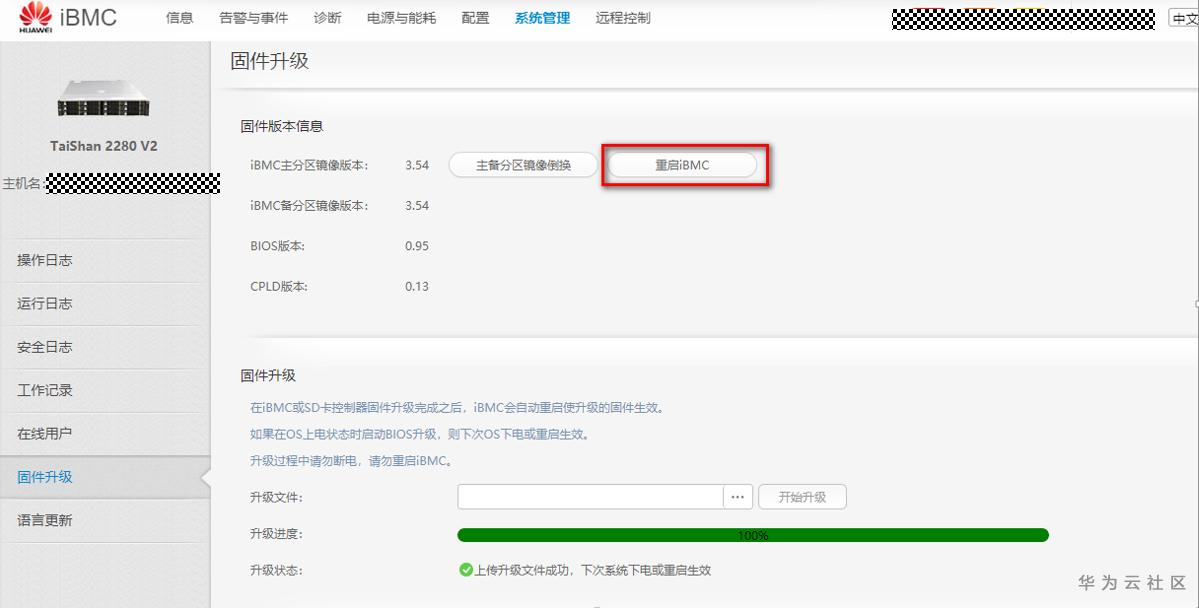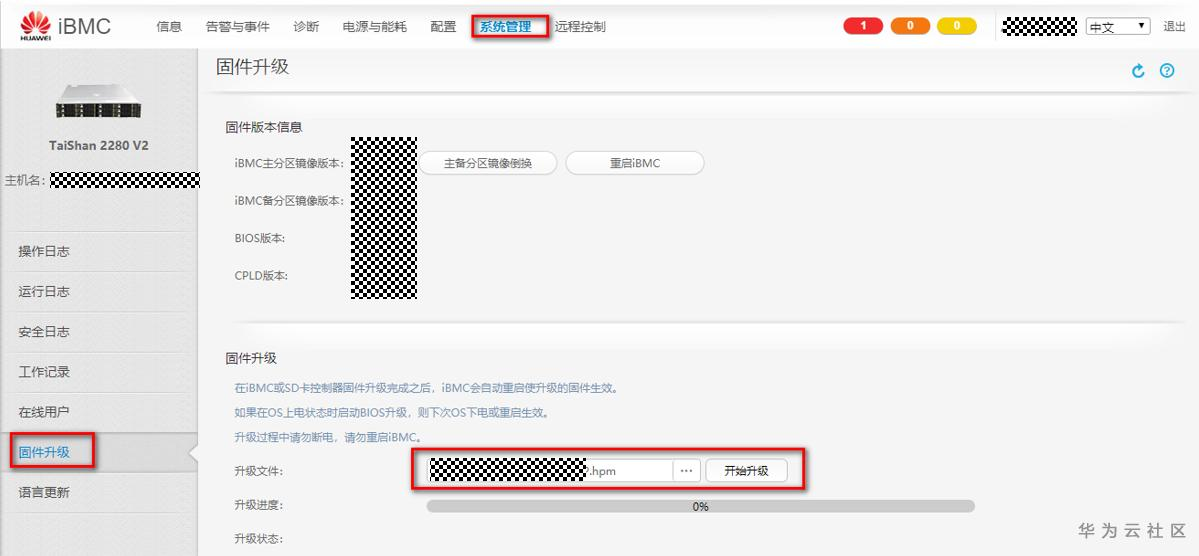 进入iBMC 选择系统管理->固件升级->选择指定固件->开始升级