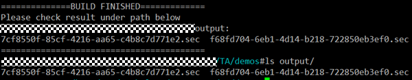 编译成功后,在ta/demos/output/路径下生成编译输出RSA加解密对应的可信应用.sec文件,格式为ID+.sec