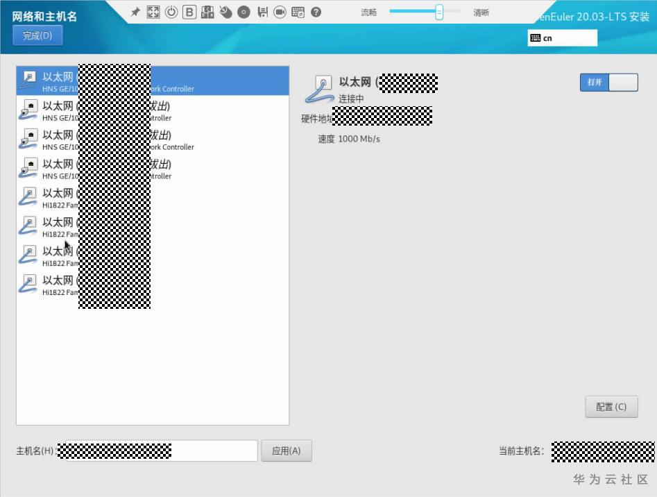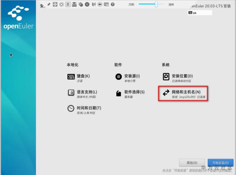 配置网络,选择“网络和主机名”,在安装过程中可以使用图形界面配置网络信息。