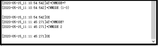 AT+CWMODE?查询当前模块的模式,1:Station;2:AP;3AP兼Station如图所示当前模式为AP模式。