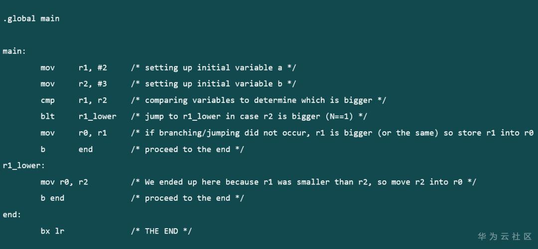 在这个例子中,程序首先比较寄存器 r1 和寄存器 r2 中的值,如果 r1 中的值小于 r2 中的值,那么跳转到 r1_lower 程序段,否则执行 blt 指令下面的 mov 指令。