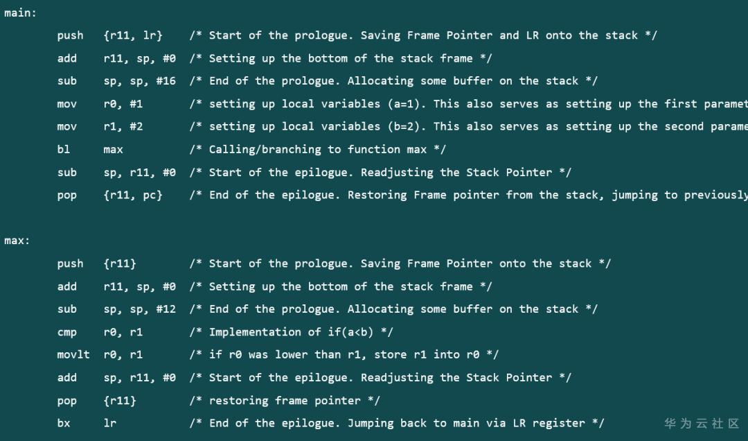 main 函数的中段主要调用了 max 函数,max 函数比较了寄存器 r0 和寄存器 r1 中值的大小,且如果寄存器 r0 中的值小于寄存器 r1 中的值,那么将 r1 中的值保存到 r0 中。函数 max 的参数是通过寄存器传递的,若参数过多也可以用栈传递。下图显示了 main 函数的主体[2]:
