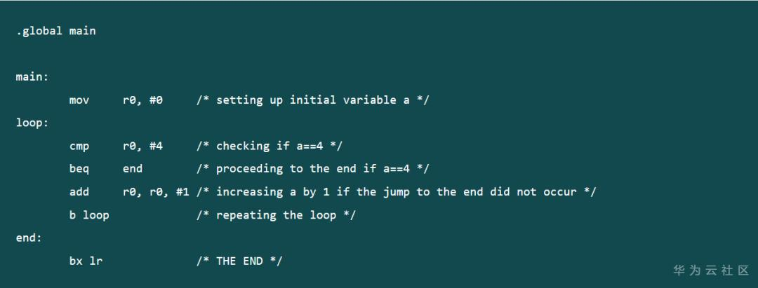 在循环的开始程序将 r0 中的值和立即数4比较,如果 r0 中的值与4相等则跳转到 end 程序段,否则将 r0 中的值自加一并继续循环,因为 r0 中的初始值为0因此循环要运行5次,最后一次跳转到 end 程序段。