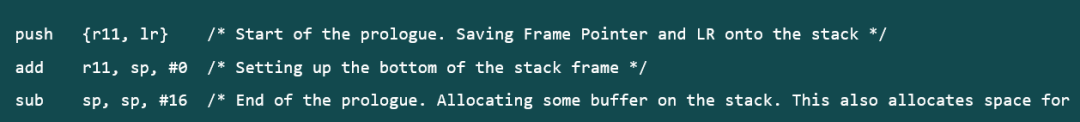 下图[2]为 main 函数的前段,在这段代码中寄存器 r11 里面保存着函数栈的地址。前段首先通过 push 指令保存栈指针和寄存器lr,然后通过 add 指令将栈底的地址存入寄存器 r11 中,最后用 sub 指令为栈分配空间。