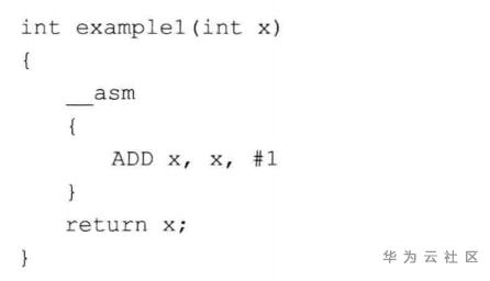 这种格式不支持在字符串中携带注释。下图展示了一个使用 ARM C 语言内嵌汇编的例子。在这个例子中,函数中变量x被汇编指令 ADD 自加一并返回,编译器为 x 自动分配了物理寄存器,1前面的#表示立即数。