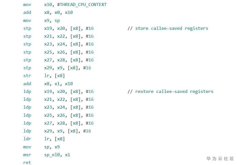 上图中这段代码用于 task_struct 切换时寄存器的保存与恢复,x0 寄存器保存了切换前 task_struct 结构体的地址,x1 保存了切换后结构体的地址。我们可以看到这段代码首先设置保存切换前寄存器的内存地址(x8 寄存器),然后将切换前寄存器编号为 x19-x29 的寄存器以及lr寄存器都保存到了以 x8 中地址为栈底的栈中,其中还包含了切换前 sp 寄存器中的栈指针。然后代码找到了保存下一个 task_struct 相关状态的栈的栈底地址(也保存在 x8 中),将栈中的内容恢复到对应的寄存器中,包括 lr 寄存器和 sp 寄存器。在这段代码中,load 和 store 指令都使用的是 post-indexed 寻址方式,也就是先使用x8寄存器中的内存地址,再将这个地址加上立即数16。