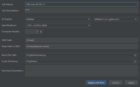 创建完毕文件夹后,接着在PyCharm打开工程,填写参数,可以参考ModelArts训练模型时填写的参数: