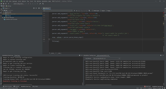 点击“Run Training Job”,右下角是从公有云传回到PyCharm的训练日志信息: