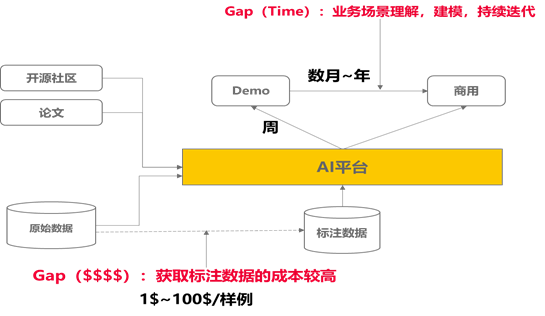 对于AI建模,本质上面是基于数据去生成模型的过程,那么一般来说,初始demo快的几天就可以出来,但是到真正落地的时候,少则花费算月,多则上年。这个过程中涉及两类的大量投入,一类投入获取训练数据,从数据收集和标注端到端,另一类投入不断模型迭代优化上,涉及到大量的领域技能。