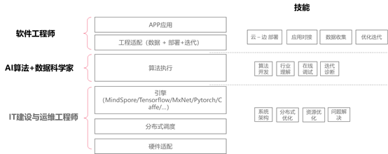 3. 算法 --> 落地; 每一个环节涉及到的人力投入不同,大致会涉及到IT工程师、数据科学家、应用工程师。
