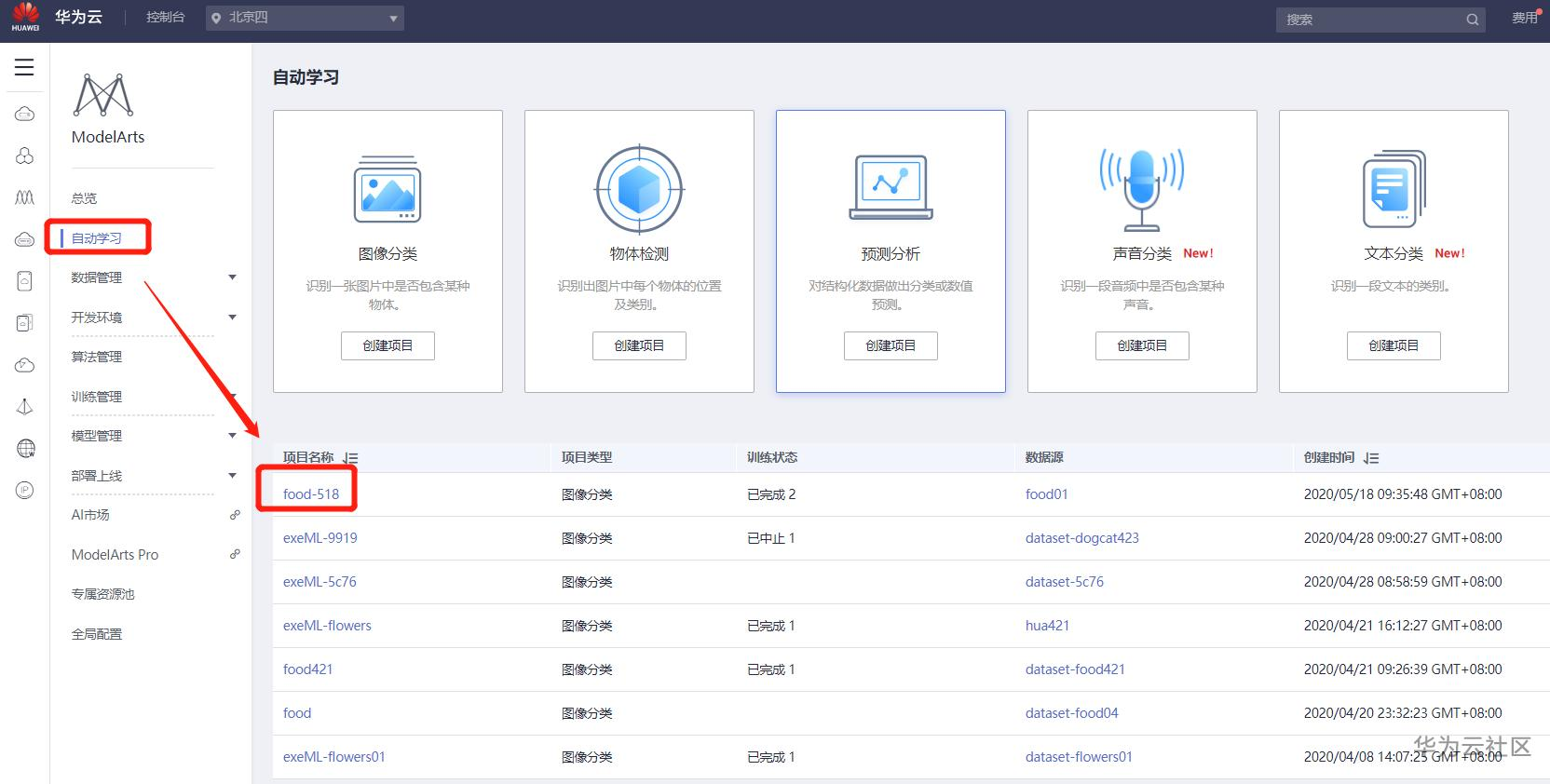 (点此链接)下载新的数据集,并解压。在控制台打开ModelArts,点击自动学习,打开1.3课程中创建的项目。