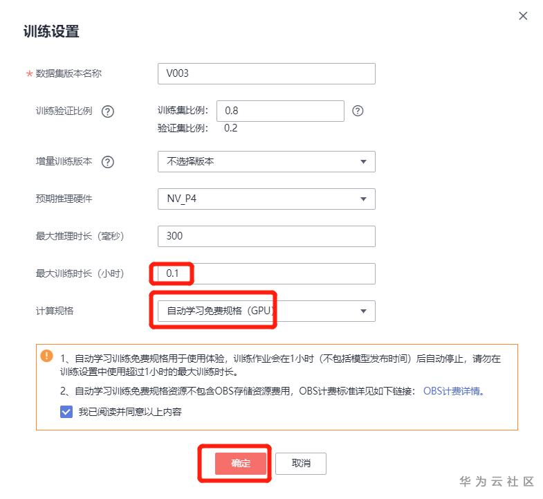 (开始训练),将最大训练时长改为0.1,使用自动学习免费规格(GPU),点击确定,等待模型训练完成。